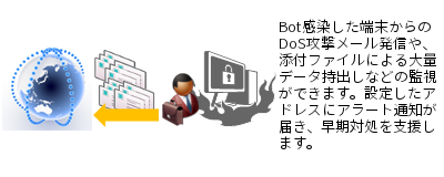 MailDepot 製品は、保存したメールの情報を監視します。そのデータを元に、情報セキュリティ対策支援が出来ます。「1ユーザの送信/受信メール数」「1ユーザの送信/受信データ容量」のしきい値を設定することで、情報漏えいの予兆検知や、Bot感染によるDoS発信端末のあぶり出し などをアラート通知します。